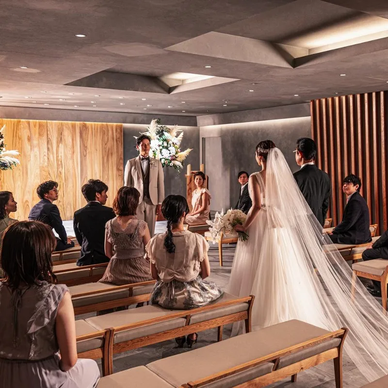 《和洋両取りスタイル★洗練セレモニー体験》卒花支持率の高い人気チャペル「MOA」で、当日さながらの入場体験を。自然光と上質な静けさに包まれる空間で、大切なゲストに見守られながら誓う穏やかなひとときを
